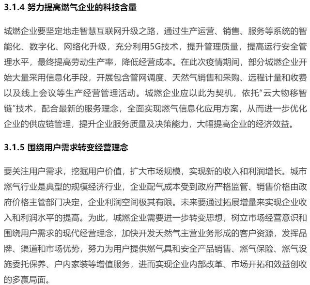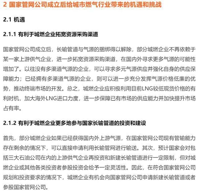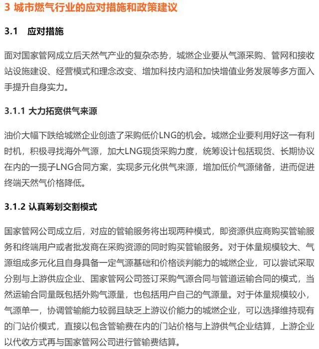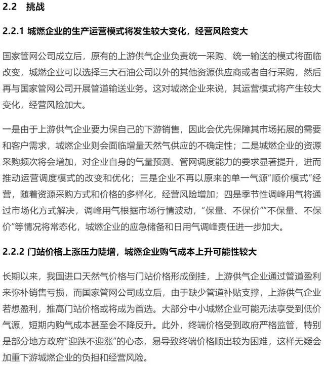 国家管网公司成立后,部分上游供气企业开展天然气直供的条件更为“成熟”,城市燃气公司的特许经营地位将受到严重的冲击。一是部分上游供气企业和其他能源企业在没有取得燃气特许经营权的情况下,利用气源优势积极向下游燃气市场延伸,通过直供方式向电厂、大工业用户供气,对于取得燃气特许经营权的城燃企业来说显然是不公平的,而且也会造成城燃企业的无序竞争,不利于城市燃气行业健康发展;二是直供打破了政府现行定价实行非居民用户补贴居民用户的交叉补贴模式,导致城燃企业执行现有配气价格时供气综合成本上升,进而影响到企业自身效益和居民用气的稳定供应。 目前来看,只有跨省的基干线被纳入国家管网公司的范畴,而省网未来将以国家管网公司控股的形式被纳入,城市燃气管网由于压力普遍较低且较为分散,因此,被纳入国家管网公司的概率较小。但是,地方政府将进一步要求城燃企业将各项收费、配气管网的各类信息等内容公开透明化,让城燃企业直接面对大众的监督。同时,国家将逐步在配售环节引入竞争机制,配售分离可能成为改革继续深化的方向之一。因此,城燃企业要未雨绸缪,做好相关研究和应对措施。