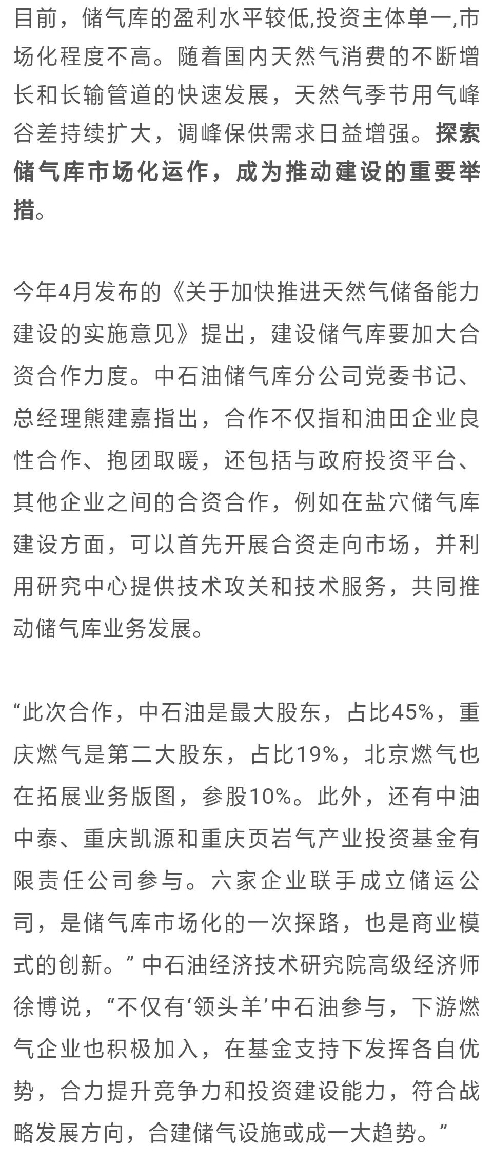 北京世创能源咨询公司首席研究员杨建红表示,合资合作是储气库优化运行的一个重要方向和渠道,六家股东强强联手,涉及产业链上下游,在保障国家能源安全和天然气保供压力之下,是个很好的示范样本。